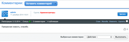 3. Добавлена поддержка новой системы выставления рейтинга для комментариев, опубликованных на сайте. Включение рейтинга для комментариев осуществляется в настройках скрипта в админпанели скрипта. А также в настройках групп пользователей вы можете разрешить или запретить выставление рейтинга для комментариев, для каждой группы пользователей персонально. Также, как и для рейтинга публикаций, в настройках скрипта вы можете выбрать какой тип рейтинга использовать для комментариев. Вы можете выбрать из трех доступных систем:
