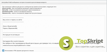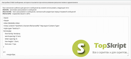 8. В админпанели, в разделе настроек шаблонов для E-mail сообщений, добавлен новый шаблон для писем, отправляемых при использовании массовой рассылки писем через панель управления скриптом. В данном шаблоне вы задаете необходимое вам HTML оформление писем, тем самым можете сделать персонализированное оформление писем для вашего сайта.