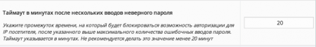 10. В настройки скрипта в раздел настроек безопасности, добавлена возможность указания интервала, в течении которого будет блокироваться IP посетителя на авторизацию, после указанного количества ошибочных вводов пароля. Ранее этот интервал был по умолчанию на 20 минут, а теперь вы можете его установить сами по своему желанию на более больший период времени, что позволит наиболее лучше обезопасить сайт от перебора паролей к аккаунтам.