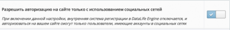 24. В настройки скрипта добавлена возможность включения авторизации на сайте только с использованием социальных сетей. При включении данной настройки, внутренняя регистрация на сайте, автоматически отключается и на сайте смогут авторизоваться только пользователи, имеющие аккаунты в социальных сетях.
