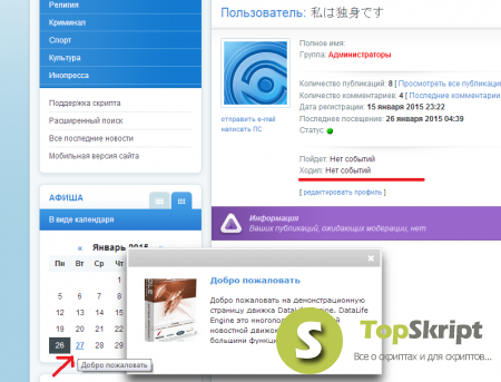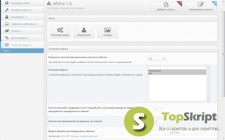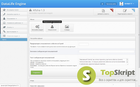 Адаптированная версия модуля Afisha 1.3 под новые версии DataLife Engine, с помощью этого модуля вы сможете оповещать пользователей о предстоящей новости или мероприятии, выхода новой серии или нового фильма. Практически все выполнено на ajax'е и кешировании, что делает модуль удобным в работе и быстрым в использовании.