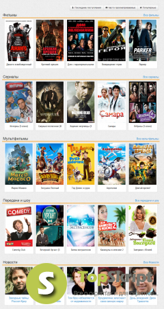 После слайдер находятся блоки Фильмы, Сериалы, Мультфильмы, Передачи шоу а так же новости: