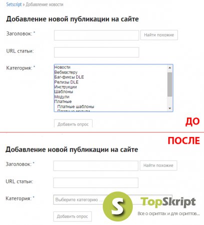 Небольшой хак, дополнение позволяет отображать категорий при добавлении новости с сайта в addnews.tpl с помощью плагина chosen, который начиная с линейки DLE 10.2 отсутствует или попросту не работает. Установка хака простая и не требует ни каких правок движка DataLife Engine.