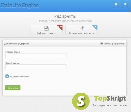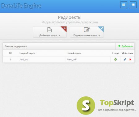 Всем известный 301 редирект для простоты использования теперь представлен в виде модуля с помощью которого можно создать редиректы для нужных адресов, это пригодится при «переносе» сайтов на DataLife Engine с других CMS или при изменении структуры сайта.