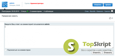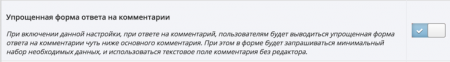 6. В настройки скрипта в админпанели, добавлена возможность включать режим быстрого ответа на комментарий. При данном режиме, ответ на комментарий вводится не в отдельном всплывающем окне, а выводится упрощенная форма ответа на комментарий, чуть ниже самого комментария. Также запрашивается минимальный набор необходимых данных, и отключается редактор для ответа на комментарий. Другими словами, основной комментарий может публиковаться полноценно, с использованием форматирования, а ответы на него уже в упрощенном виде.