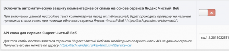 15. Добавлена новая автоматическая система защиты комментариев от спама на основе облачного сервиса "Яндекс Чистый Веб". Подробнее об этом сервисе вы можете прочитать на странице https://tech.yandex.ru/cleanweb/. Особенностью данной защиты является то что анализируется непосредственно сам текст комментариев на наличие признаков спама, а не только на основе IP и e-mail пользователя, хотя эти данные также учитываются.