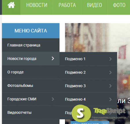 - 3 вида меню: верхнее выпадающее, в левой колонке выпадающее и обычное в правой колонке;