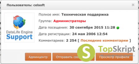 25. Для шаблонов вывода профиля пользователей (userinfo.tpl и profile_popup.tpl) добавлена поддержка новых тегов [not-profile-user-group=X] Текст [/not-profile-user-group], которые выводят текст заключенных в них, если группа пользователя, профиль которого просматривается, не принадлежит указанной группе X. Где X это номер группы. Назначение данных тегов противоположно описанным в предыдущем пункте. Например, вы можете указать [not-profile-user-group=1,2] Текст [/not-profile-user-group] и в данном случае будет выведен текст, если просматривается профиль пользователя, не принадлежащий администраторам и главным редакторам. Тем самым вы можете для разных групп пользователей, делать различное оформление их профиля.