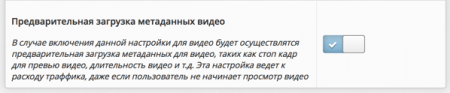 14. В настройки видеопроигрывателей в админпанели добавлена возможность включать или отключать предварительную загрузку метаданных видео. Если данная настройка включена, то плеер подгружает предварительно для видео данные о видео, а именно его продолжительность и первый стоп кадр видео для превью в плеере. В случае отключения данной настройки эти данные не загружаются, тем самым вы можете экономить трафик сервера и пользователей, если они не будут просматривать данное видео.
