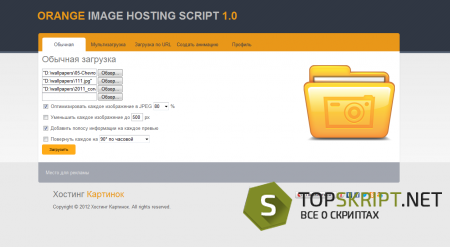 - 4 вида загрузки: обычная мультизагрузка, флэш мультизагрузка, мультизагрузка по URL, а также особый вид загрузки - создание gif баннера из нескольких изображений