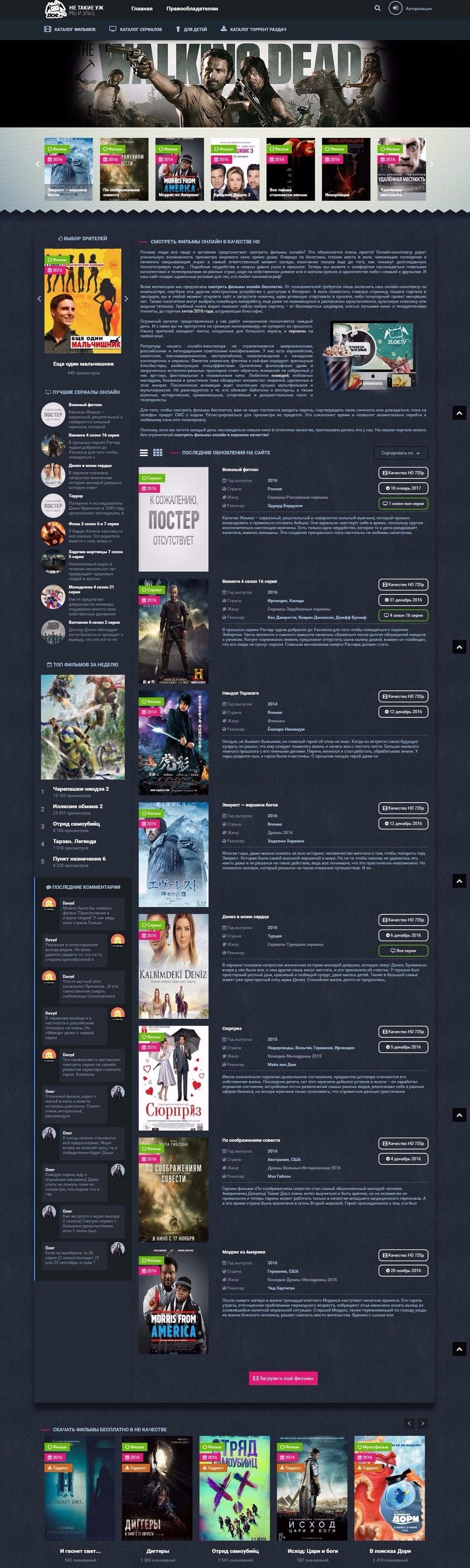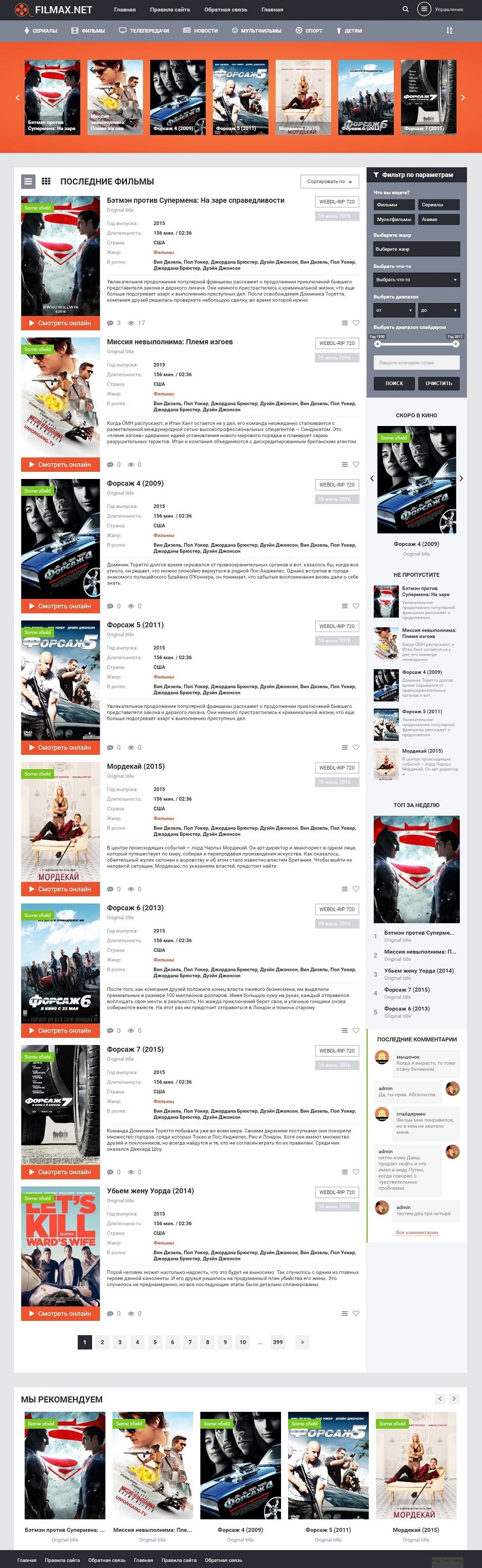 Filmax адаптивный кино шаблон для DLE, за основу стиля взято от популярного сайта Filmix. Так же можно выделить наличие тёмной версии шаблона. В шаблоне сделан современный рейтинг без каких либо правок движка, со шкалой и процентами. Вид новостей переключается кнопкой с запоминанием. Сделан удобный вид сортировки, а так же выведен блок с красивым оформлением фильтра. Самого модуля фильтра в комплекте нету, он продается отдельно примерно 300 р. (вместе с установкой). больно надо можно и обойтись. В полной новости присутствует всё необходимое: информация о фильме, описание, кадры, плееры во вкладках, комментарии.