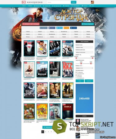Кинорезка для DLE - это адаптивный шаблон для кино сайтов по привлекательной цене. Немаловажной особенностью является комплект из тёмной и светлой версий шаблона. Меню с жанрами можно расположить в отдельном блоке, а если этого будет мало, то в основном меню так же имеется подменю с жанрами. На главной странице основной контент разделен на блоки: фильмы, сериалы, мультфильмы, и т.д. и сделано это в виде слайдеров-каруселей. Еще одной особенностью шаблона является ajax подгрузка фильмов нажатием кнопки. На странице просмотра фильма сделано всё аккуратно и информативно. Имеется всем уже знакомый рейтинг с раздельными лайками/дизлайками, а также плееры во вкладках, кадры, описание. На странице категории в правой колонке можно увидеть блок с фильтрацией фильмов. В шаблоне выведено лишь оформление, без нужного модуля данный блок работать не будет.