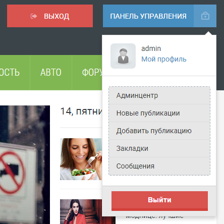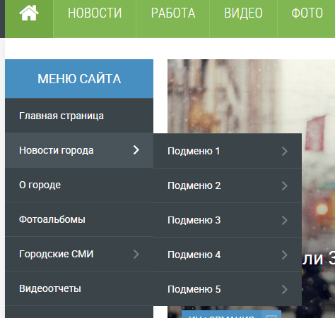- 3 вида меню: верхнее выпадающее, в левой колонке выпадающее и обычное в правой колонке;