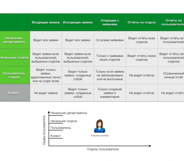 Пользователь отдела - Пользователи с данными привилегиями могут создавать, получать и переадресовывать заявки, а так же быть привязаны к одному или нескольким отделам.