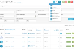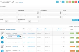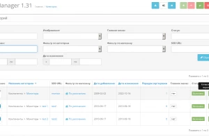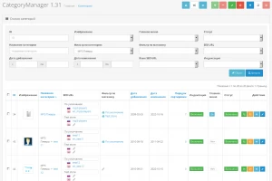 доступно изменение изображения, названия категории, seo-url, привязки к магазинам, порядок сортировки, быстрая смена статуса и показа в главном меню *