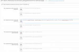 Модуль позволяет задать индивидуальный текст для каждого статуса заказа раздельно для нового и смены статуса, а также отдельный текст для администраторов (для администраторов возможно задать несколько номеров телефонов)