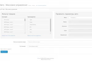 9) Для массовой привязки товаров к автомобилю нужно установить в модуль Дополнения - Модули - Авто - Массовое управление, выставить настройки фильтрации товаров и выбрать параметры авто для привязки. После этого нажать кнопку выполнить, и всем товарам с выбранными параметрами фильтра будут присвоены выбранные параметры авто.
