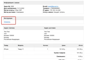 - Возможность использования инструкции к оплате при оформлении заказа (использование переменных таких как «номер заказа», «ссылка на оплату», «сумма заказа», «комиссия» и html тегов)
