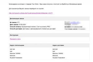 - Возможность использования инструкции к оплате в письме о заказе (использование переменных таких как «номер заказа», «ссылка на оплату», «сумма заказа», «комиссия» и html тегов)