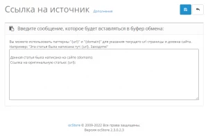 Данный модуль третье и на мой взгляд, наиболее правильное решение размещения ссылки на первоисточник. И так, его работа основана на jаvascript, который отслеживает событие браузера копирования текста. И производит модификацию буфера обмена пользователя, добавляя заданный в админке модуля произвольный текст, поддерживающий использование переменных для гиперссылок (к примеру ссылка на страницу где было произведено копирование или же на основной домен).