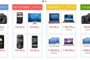 Данный модуль выводит по 4 товара из четырех модулей (Рекомендуемые, Акции, Хиты продаж, Новинки) на одной странице. Также дополнительно создает вывод на отдельной странице всех товаров из каждой группы.