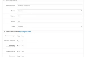 Banner MultiPosition v1.0 by Tramplin Studio - это модификатор который расширяет возможности стандартных баннеров в OpenCart. Он дополняет настройки баннеров рядом возможностей, которые позволяют добиться очень высокой гибкости при размещении баннеров на страницах вашего интернет-магазина. Изменения затрагивают как настройки самих баннеров, так и непосредственно модули: баннеры, карусель и слайдеры.
