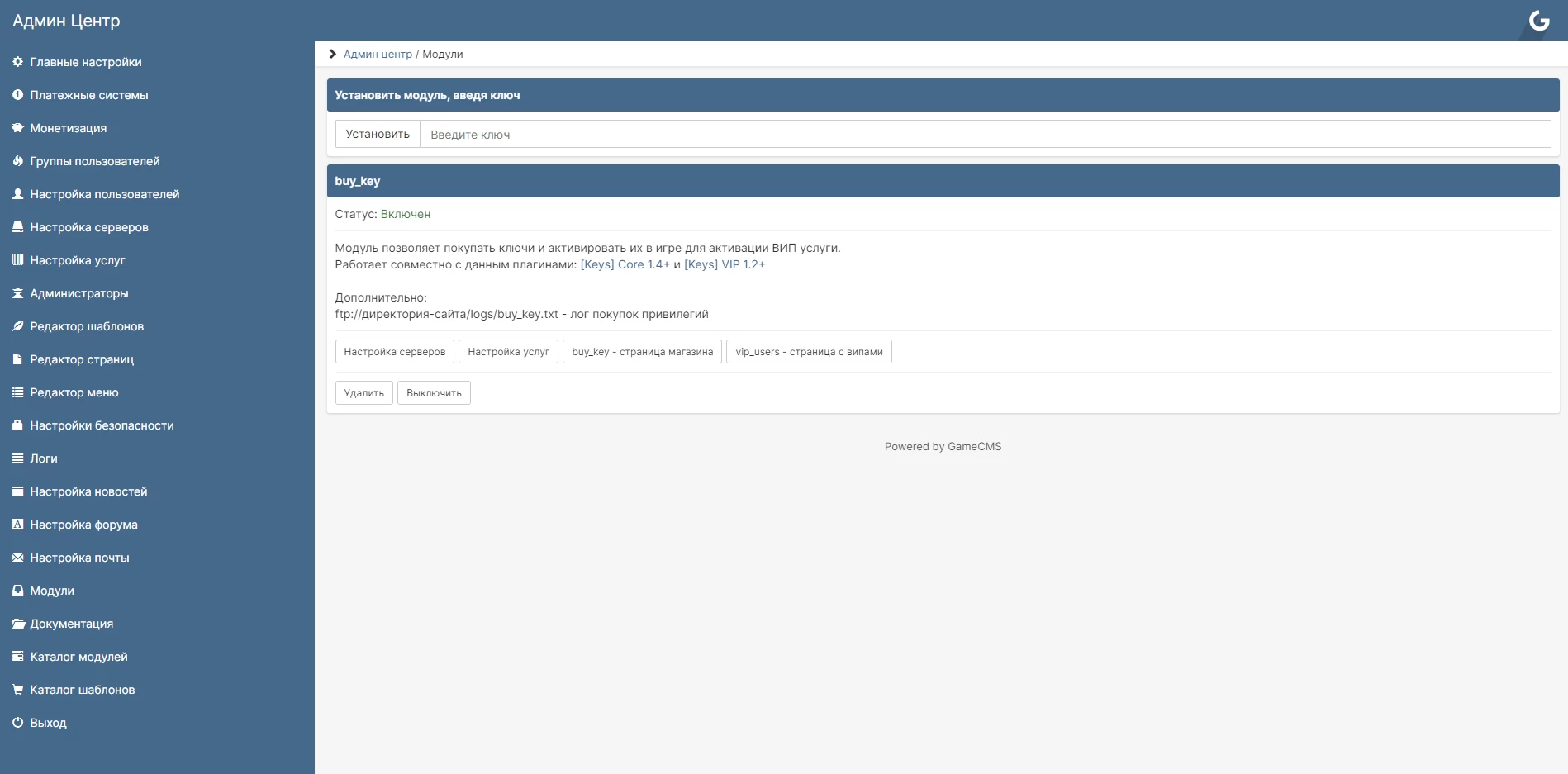 Модуль позволяет пользователям покупать ключи и активировать их в игре для активации ВИП услуги. Работает совместно с данным плагинами от RIKO: [Keys] Core 1.4+ и [Keys] VIP 1.2+