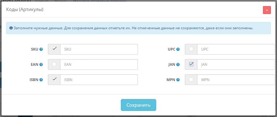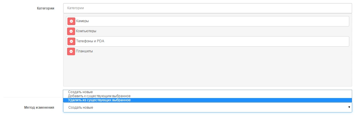 - Удалить из существующих выбранное. Удаляет у выбранных товаров из существующих данных указанное.