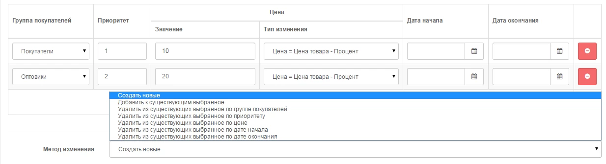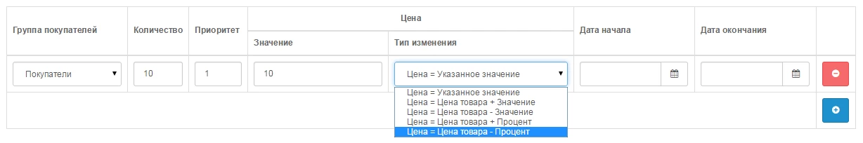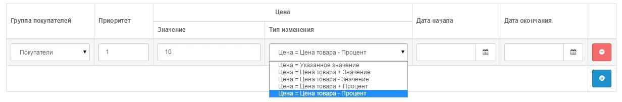 Добавить ( + ) Добавляет к цене указанное значение при типе изменения цены "Фиксированная сумма", если тип изменения "Процент", то добавляет к цене указанное значение в процентах от цены;