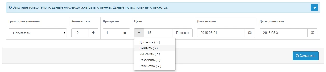 Умножить ( * ) Умножает цену на указанное значение при типе изменения цены "Фиксированная сумма", если тип изменения "Процент", то умножает цену на указанное значение в процентах