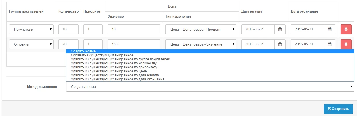 Возможность изменить любые данные в действующих скидках, причем скидки не удаляются, а только изменяются необходимые данные, которые указаны:
