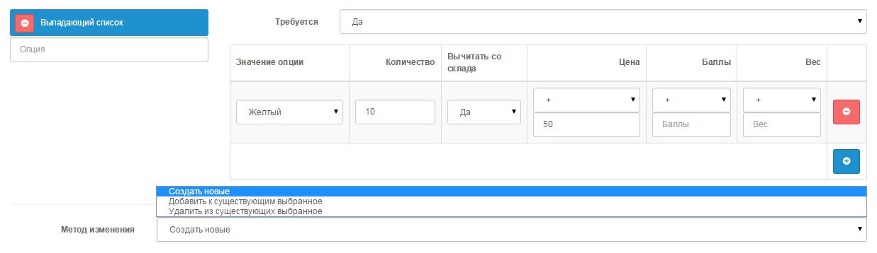 Возможность массового создания и изменения опций, доступно 3 варианта действий: