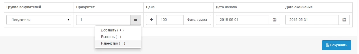 Равенство ( = ) Цены у всех выбранных товаров будут равны указанному значению.