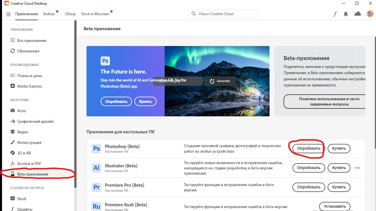После проделанной работы открываем Creative Cloud и заходим в раздел Beta-приложения.