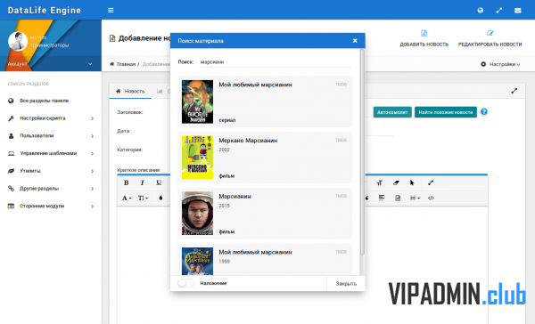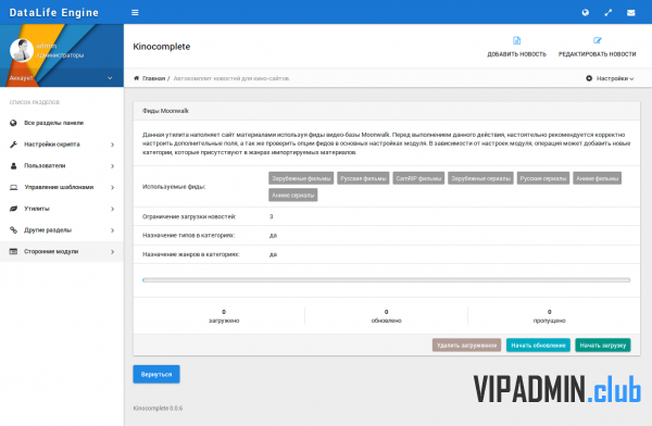 Модуль «Kinocomplete» для Datalife Engine - это основной инструмент наполнения современного киносайта. Автоматизация поиска, массовое добавление и обновление материалов Вашего ресурса теперь доступно в один клик!