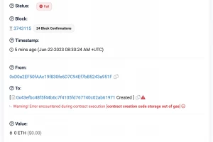 Нода взяла транзакцию в обработку и запустила на своей локальной EVM код который находился в поле data. В процессе исполнения был создан аккаунт для контракта, и начался процесс деплоя контракта в storage этого аккаунта. В ходе деплоя было обнаружено, что в транзакции недостаточно Gas для завершения процесса, и возникла ошибка: Out of Gas error.