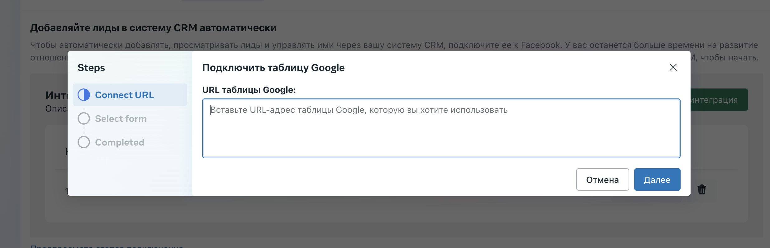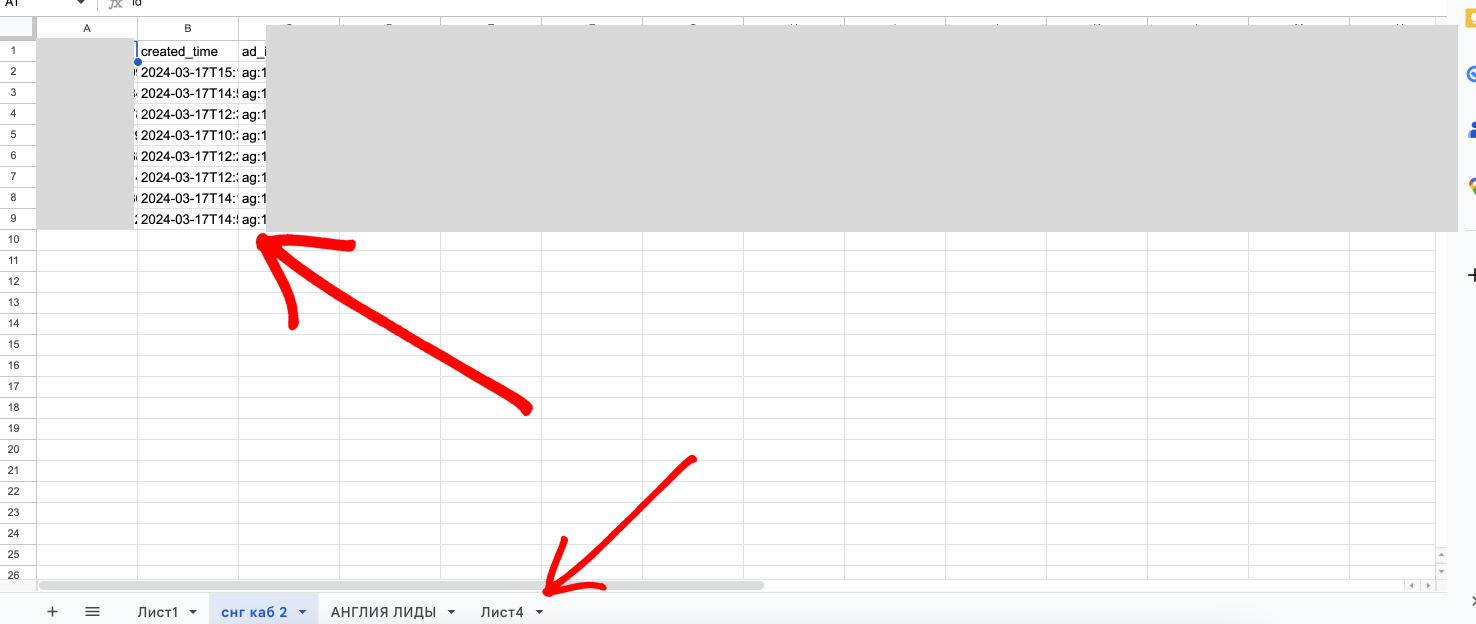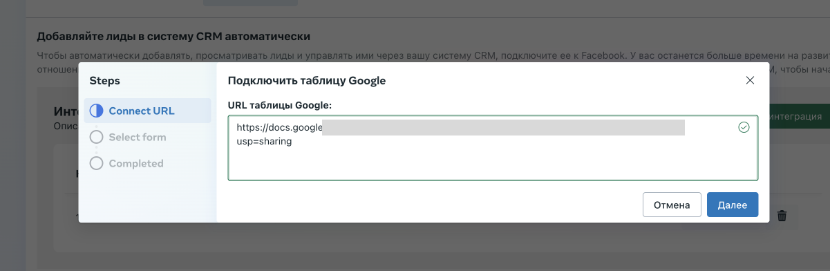 Выбираем лист в таблице, куда будут переноситься лиды, и нажимаем "Подключить".