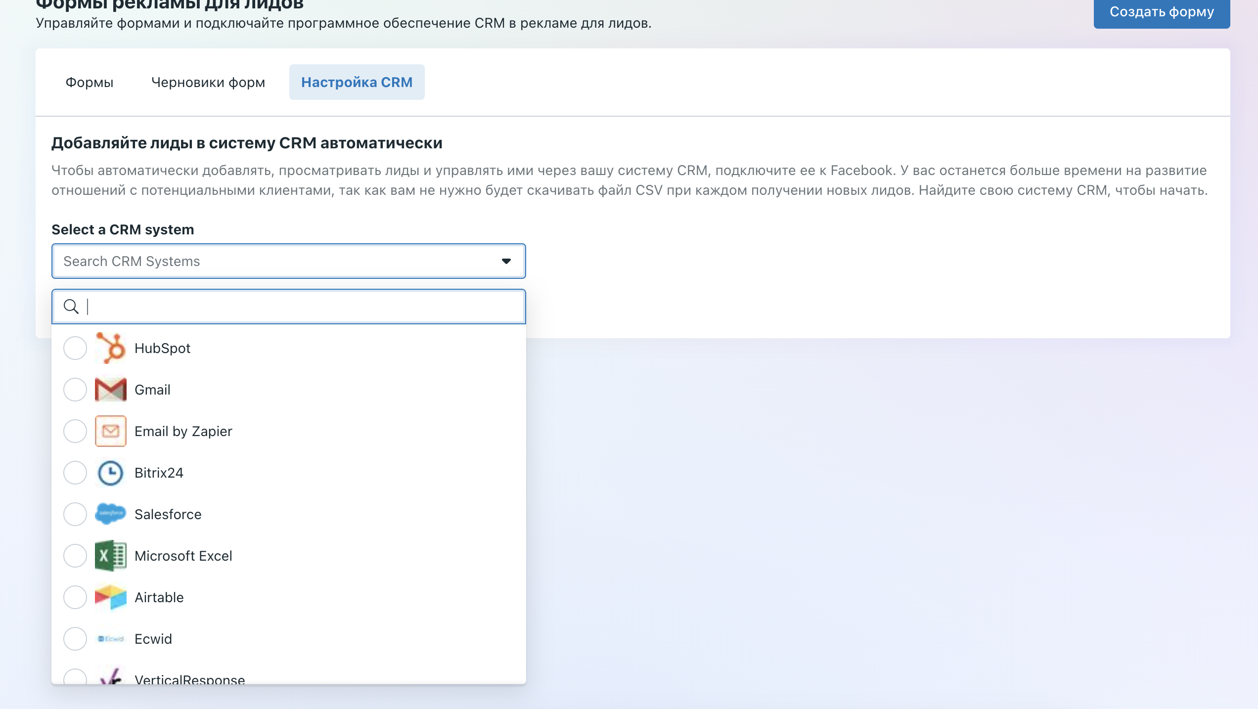 Переходим на страницу Facebook по ссылке https://business.facebook.com/latest/instant_forms/