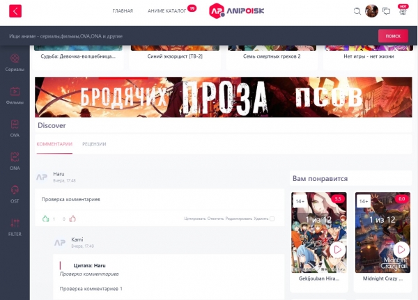 Шаблон AniPoisk - dashboard v3.0 for DLE - яркий и современный дизайн привлечет взгляд и заставит остаться рядового посетителя, данный шаблон имеет адаптивный шаблон, то есть он будет прекрасно смотреться как на больших экранах, так и на мобильных устройствах и планшетах, тематика шаблона - сайты с просмотром онлайн аниме. Шаблон основан на современных технологиях, CSS GRID LAYOUT, FLEXBOX, MOBILEFIRST. На главной, вкладки (запоминают выбранную вкладку) с выводом новостей, которые выводятся плиткой с помощью CSS GRID LAYOUT, с выводом последних обновлений, и разделением на сезоны. Удобная навигация по сайту, здесь и отдельный вывод категорий и подкатегорий, выезжающая панель с выводом последних комментариев, выезжающая панель с вкладками, выезжающая панель с оформлением под фильтр новостей. С левой стороны расположен сайдбар с выводом категорий и подкатегорий, также изюминкой этого шаблона, стало внедрение музыкального плеера который поддерживает плейлисты, вы сможете выводить как один трэк так и плейлист, задавать артистов и cover к ost или альбому, и выводить их в боковой панели, плеер зафиксирован. В категориях выводится карусель по custom через ajax-вкладки, с выводом рейтинговых новостей и по просмотрам, для каждой категории и подкатегории формируется свой рейтинг и свой топ оп просмотрам пользователей. Также стоит уделить внимание подгрузка информации коротких новостей,при клике на новость, все остальные новости затухают, а с выбранной появляется подробное описание с постером, также в данном шаблоне используется функциональная галерея "Fancybox 3" для вывода скриншотов,красивый рейтинг с 5 звезд по 10 бальной шкале с выводом круговой диаграммы. Интересно построена полная новость, информация преподносится пользователю с максимальным вборосом, здесь и оформление под модуль расписание, хронология, места для рекламы, вкладки с запоминанием выбранного состояния, в которых выводятся описание, скриншоты сделаны в виде плитке на css, отдельная вкладка для трейлером и опенингов, в самом низу имеются вкладки с запоминанием выбора, в которых выводятся комментарии и рецензии. Также в шаблоне интересным образом сделана пагинация по страницам, она имеет фиксацию что придает ей удобства. В профиле интересным образом выведена информация о пользователи, также имеются вкладки с запоминанием выбора, в которых выводятся закладки(оформление под модуль списки в профиле),а также редактирование информации о пользователи.Имеется отдельное оформление под топ 100 аниме. Отдельное оформление полной и короткой новости для OST. Специально для шаблона были разработаны интересные иконки. Особое внимание стоит уделить мобильной версии шаблона (обязательно смотреть скриншоты)