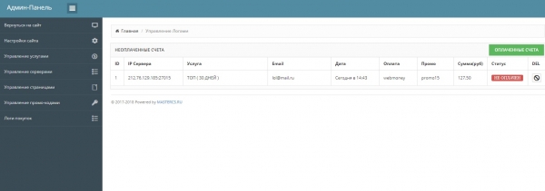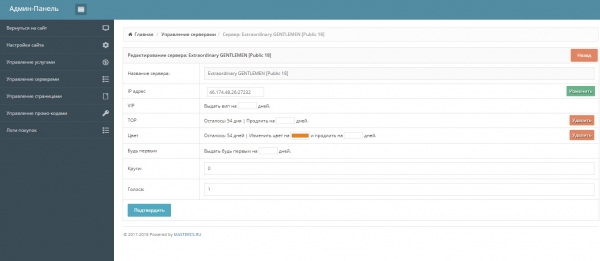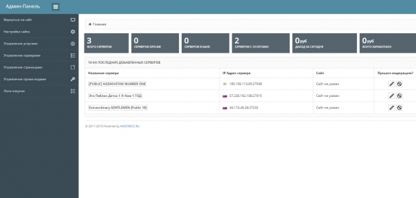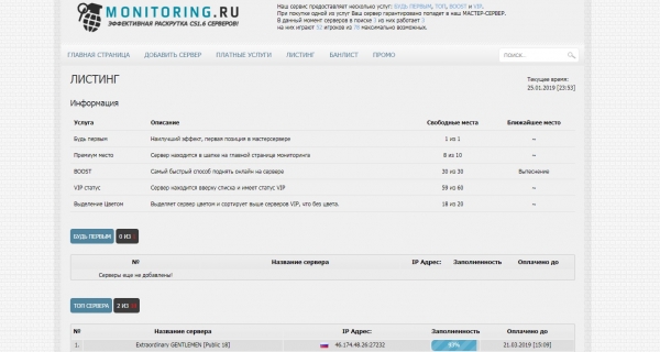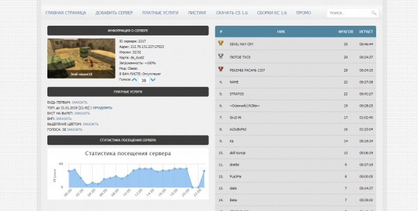 Мониторинг игровых серверов CS 1.6 с рабочей автооплатой(webmoney, free-kassa, при желании можно подключить любую кассу). В мониторинге имеются различные услуги такие как Будь Первым, Топ, Буст, Вип, Выделение цветом и голоса. Всё легко настраивается в файле init.php (данные для входа в админ панель, пароль для крона, подключение к базе данных и т.д), так же после установки в админ панели есть раздел Настройки.