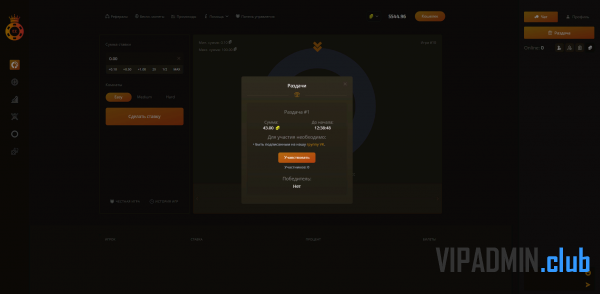 Раздача - возможность создания раздачи, условия могут быть пополнить счет или вступить в группу, или и то и то, так же начисления могут быть на бонусный и реальный счет, сумма указывается в админке. Игроки вступают в раздачу и по истечении времени случайным образом выбирается победитель которому выдается приз