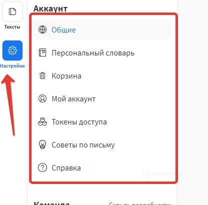 В разделе « Общие » пользователь может изменить тему, отображение языка, родной язык, а также настроить тщательный режим для новых текстов. Тут же осуществляется настройка разновидности языка.