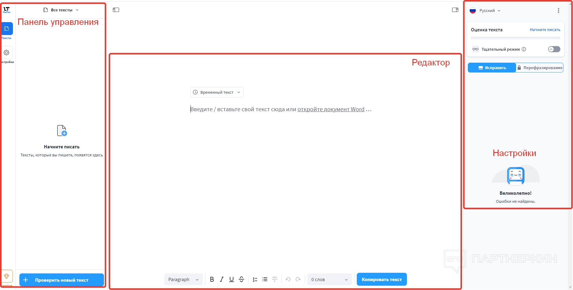 Когда регистрация завершится, пользователь увидит все ту же стартовую страницу сервиса, где есть экспресс-форма для редактирования текста. Только в этот раз можно будет уже воспользоваться полноценным редактором, доступ к которому можно получить в правом верхнем углу. Однако для начала разберем все блоки и разделы, которые находятся в панели управления сайта.