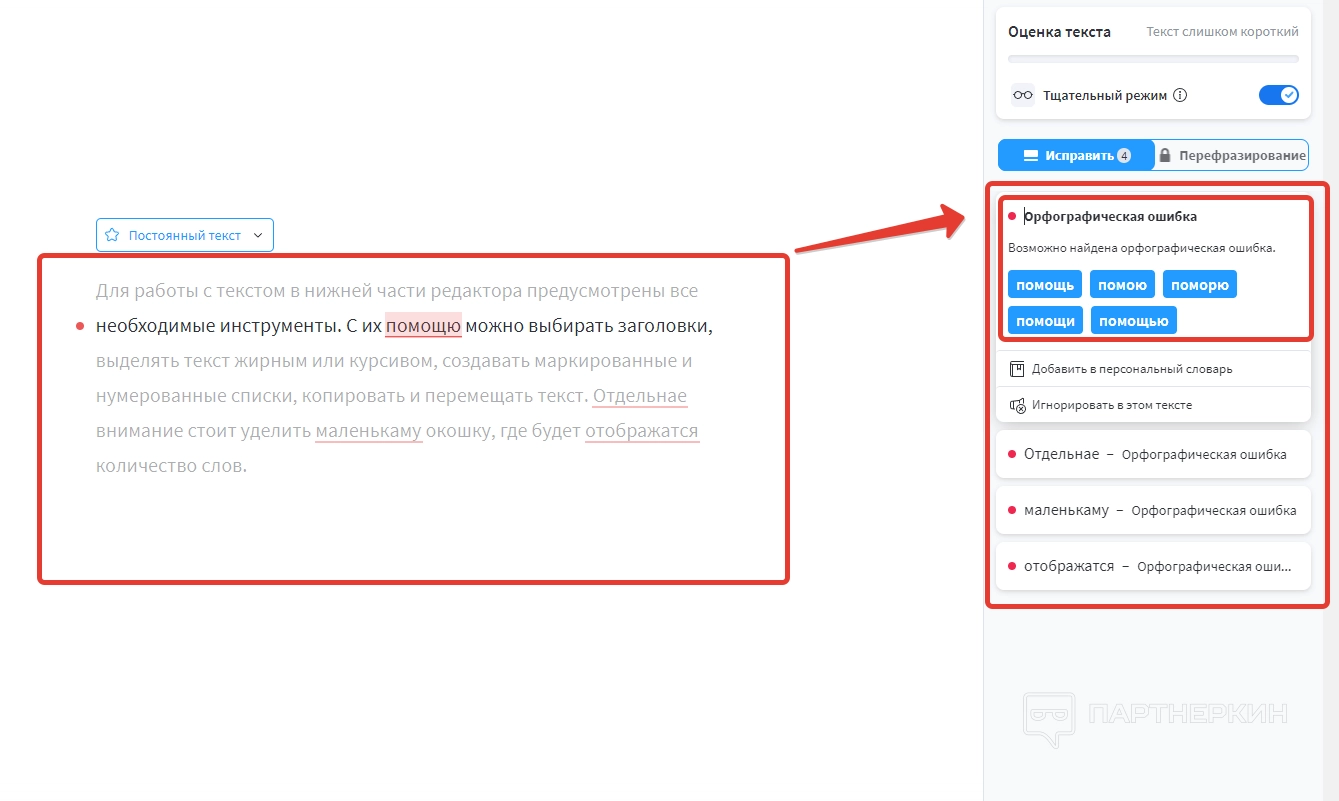 Когда написанный текст будет вставлен на проверку, система его просканирует и отобразит найденные ошибки в блок настроек. Все ошибки будут отображаться списком в соответствующей колонке. Если нажать на одну из ошибок, система развернет окно с правильными и похожими вариантами. С помощью специальных кнопок слово можно добавить в словарь или игнорировать ошибку.