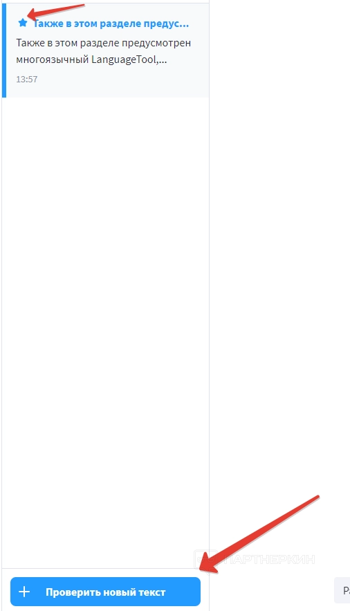 Созданный текст будет автоматически помещен в панель управления. Звездочка напротив первых слов говорит о том, что текст относится к категории «Постоянный текст», поэтому не будет перемещен системой в корзину. Чтобы начать работу над новым содержанием, спускаемся в нижнюю часть панели управления и жмем на «Проверить новый текст». Сразу после этого откроется пустая рабочая зона.