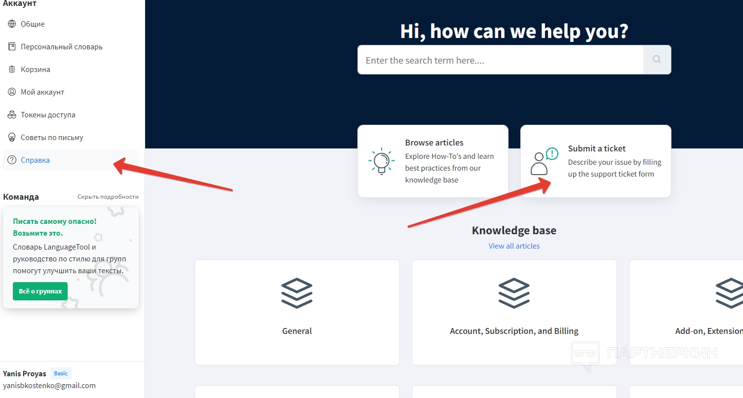 В разделе « Токены доступа » можно получить доступ к API. Однако для начала нужно перейти на платную подписку. Блок « Советы по письму » предлагает разные обучающие материалы по сервису. Чтобы обратиться в техподдержку, переходим в раздел « Справка » и жмем Submit a ticket. Откроется форма, где нужно указать электронную почту и описать свою проблему.