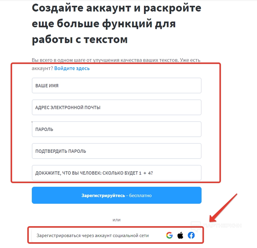 В процессе регистрации нужно указать имя, электронную почту и пароль. Также придется решить простую задачку в качестве капчи. Если пользователь не хочет проходить ручную регистрацию, можно воспользоваться авторизацией через аккаунты Google, Apple и Facebook*.