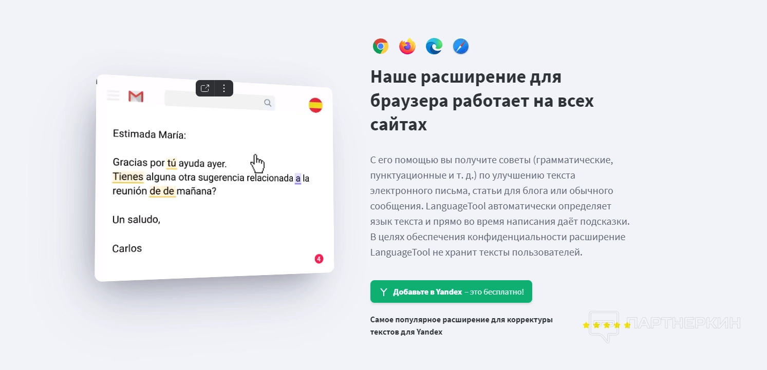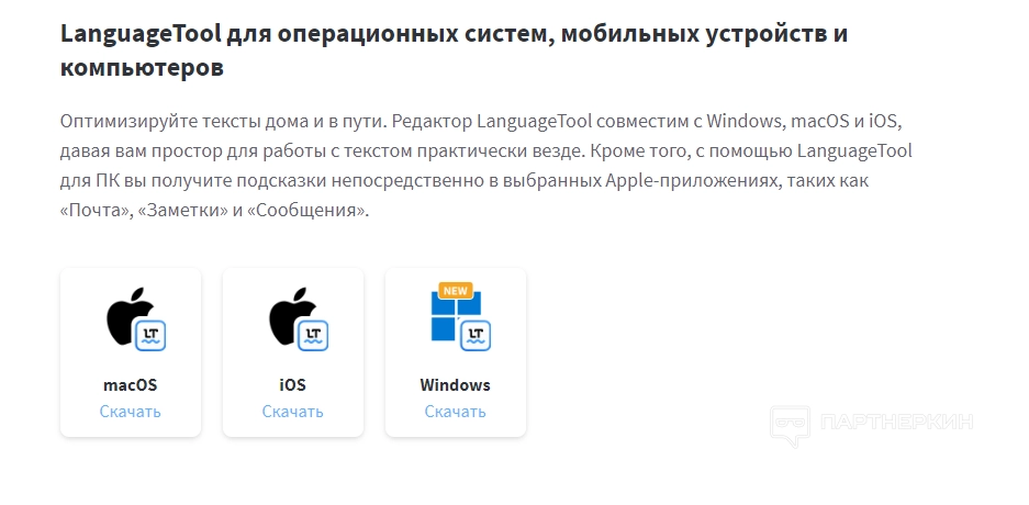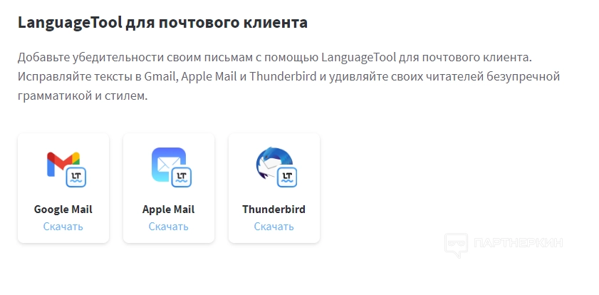 Также есть расширения для почтовых клиентов Google Mail, Apple Mail и Thunderbird. С их помощью можно редактировать тексты и исправлять ошибки в самих почтовых клиентах, не переходя в сервис.