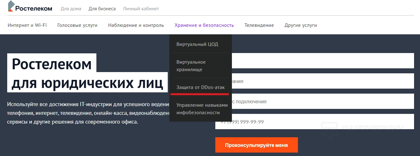 Чтобы подключить защиту Anti-DDoS от «Ростелеком», пользователю необходимо зайти на официальный сайт и выбрать раздел «Для бизнеса». На этой странице нужно найти раздел «Хранение и безопасность» и нажать «Защита от DDoS-атак».