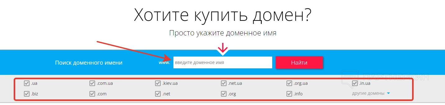 Ниже на главной странице расположен блок для поиска и приобретения доменов. Там есть поисковая строка и форма, в которой можно выбирать доменные зоны.